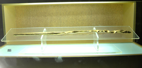 金杖,三星堆一号祭祀坑出土文物,全长1.42米,直径2.3厘米,净重约500克。金杖是已出土的中国同时期金器中体量最大的一件。现藏三星堆博物馆。