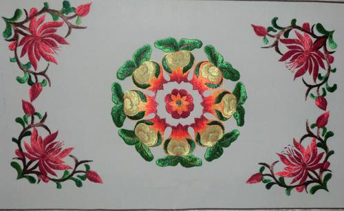多用彩色丝线,挑、编相兼,密扎排列,留空显花组图,编挑美观大方,但不经洗,多适用于飘带、鞋面、头帕。