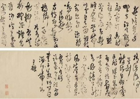 王铎的狂草立轴动辄二米以上,“一笔”书写多达十几个字,有时一行二十余字,仅略有一断笔处,最令人惊讶的不仅仅是文字数量上的比较,关键是王铎凭借高超的艺术技法和过人的胆识,一根线条连续盘桓纵横,构筑出动人心魄的艺术幻妙境界。遒迈宕逸的字间组合,化百炼钢作绕指柔,上下承接,笔势振荡,不绝连绵,奔腾跃动,左冲右突,纵放得意,正极奇生的行列关系,犹如一曲《滚滚长江东逝水》,雄浑浩荡,沁人心魄。王铎“一笔书”丰满了狂草的新语汇。