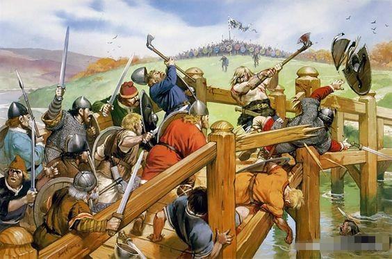 然而,此时一名人高马大、体型壮硕无比的维京巨汉手持双手巨斧,单枪匹马在桥头将蜂拥而至的英格兰人挡住。只见他发出骇人的战吼,不知疲倦地在人群中挥舞着手中的战斧,淋漓的鲜血、四散的碎肉和刺耳的惨叫声一时间充斥桥头,一连多达40名英格兰士兵成为了斧下亡魂,惊恐万分的英格兰人被这位猛士所震住了,一时间不敢过桥。所谓的"一夫当关万夫莫开",莫过于此。