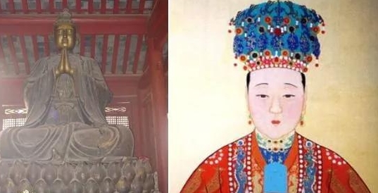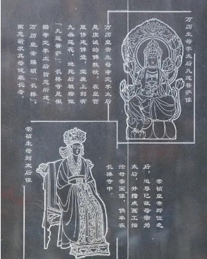 这个“九莲菩萨”与众不同。因为一般的菩萨像,多为在莲台,上做说法状,此菩萨像却是端坐于法坛之内,气质呈散淡而不羁貌,且散缀于莲池中的九朵莲花格外醒目,布局夸张。菩萨像一般坐北朝南,她却坐南朝北。原来,这个菩萨不是来自西天净土,而是万历皇帝的生母孝定太后的化身像。