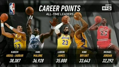 2月19日,NBA常规赛湖人主场迎战篮网的比赛中,詹姆斯在第二节末段依靠罚球达成NBA职业生涯常规赛35000分的新里程碑。