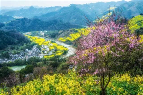 位于上饶的婺源县,被誉为中国最美的乡村,它有着中国最美的春天,三月中下旬,棵棵粉红的桃花、洁白的梨花点缀在漫山遍野金黄色的油菜花中,掩映着白墙灰瓦的徽派建筑,使得每一个逃离纷繁城市的人都能找到归宿。余邵诗云:“油菜花开满地黄,丛间蝶舞蜜蜂忙;清风吹拂金波涌,飘溢醉人浓郁香”。清明时节,素以秀美的田园风光、淳朴的古村文化着称的婺源成为人们踏青郊游的首选之地,婺源篁岭被誉为“最美梯田”之一,周边千亩梯田簇拥。每年3-4月,婺源篁岭山间油菜花全面盛开,千亩梯田油菜花同时绽放,漫山遍野。